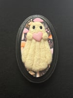 A hand felted Ghostie, mounted on a decoupaged and painted wood plaque, and ready to hang with your spooky decor!