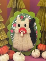 A hand felted Ghostie, mounted on a decoupaged and painted wood plaque, and ready to hang with your spooky decor!