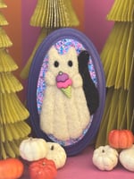 A hand felted Ghostie, mounted on a decoupaged and painted wood plaque, and ready to hang with your spooky decor!