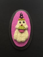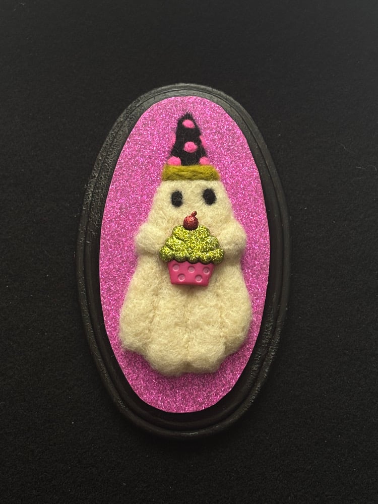 A hand felted Ghostie, mounted on a decoupaged and painted wood plaque, and ready to hang with your spooky decor!