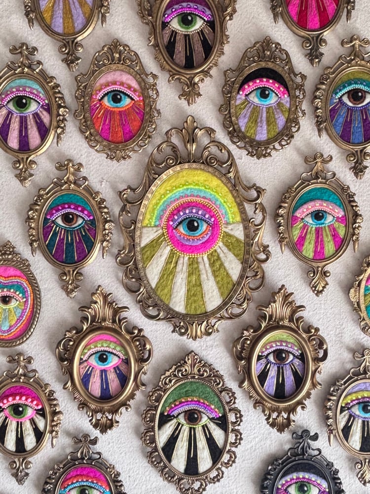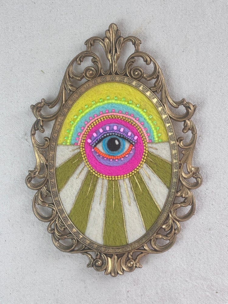 Needle felted wool with embroidery and bead embellishments, presented in a vintage frame. Signed and ready to hang.