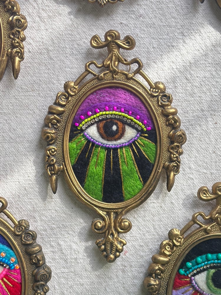 Needle felted wool with embroidery and bead embellishments, presented in a vintage frame. Signed and ready to hang.