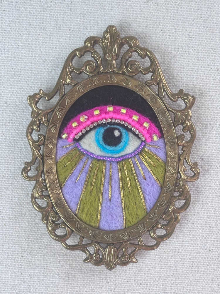 Needle felted wool with embroidery and bead embellishments, presented in a vintage frame. Signed and ready to hang.