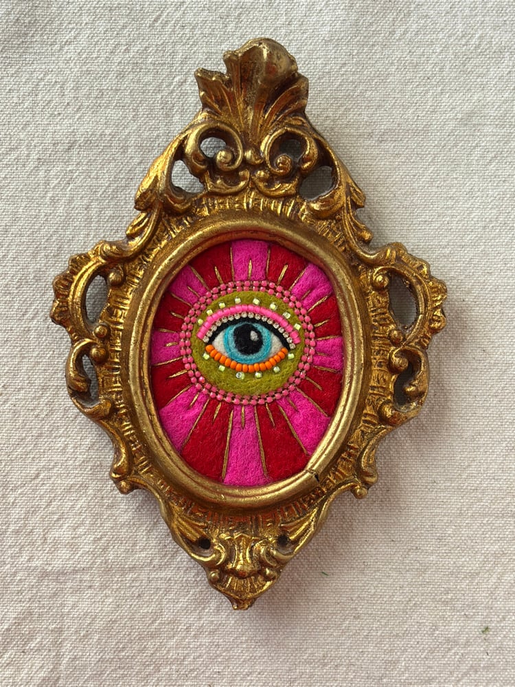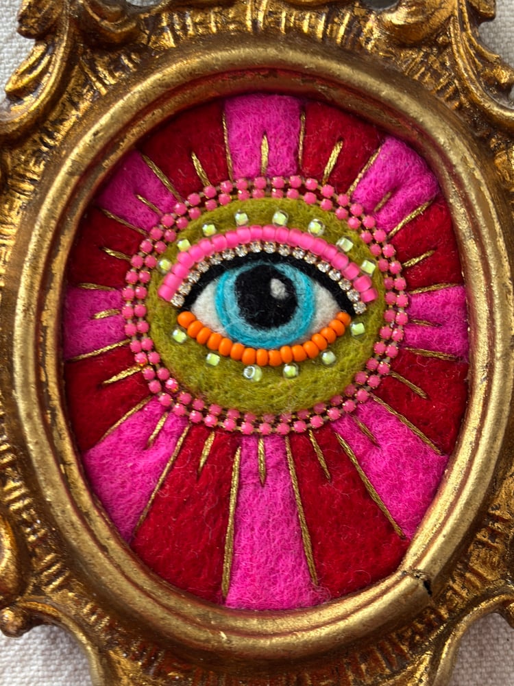 Needle felted wool with embroidery and bead embellishments, presented in a vintage frame. Please note that there is a small, non structural crack to the lower right center, shown in the photos, which I believe just adds to its history and charm!