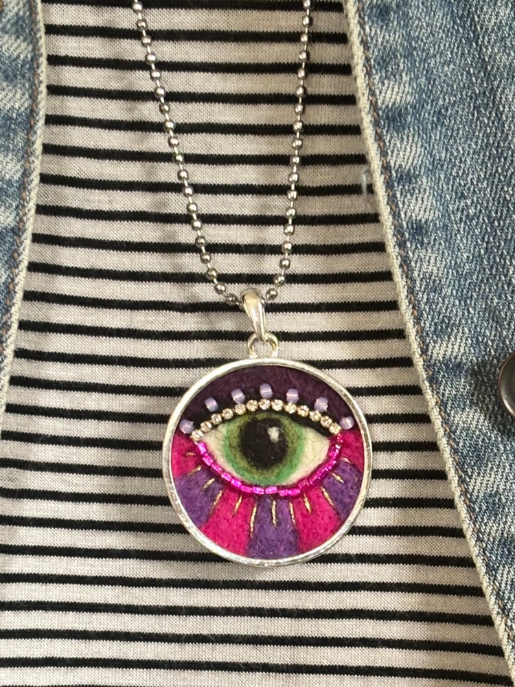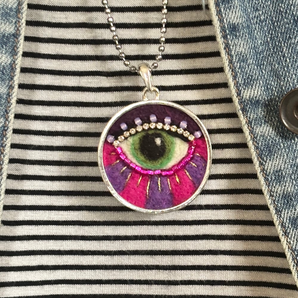 A hand felted mystic eye, embellished with rhinestones and glass beads, in a bright silver base metal pendant.