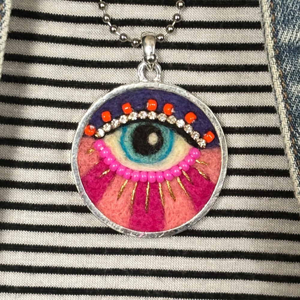 A hand felted mystic eye, embellished with rhinestones and glass beads, in a bright silver base metal pendant.