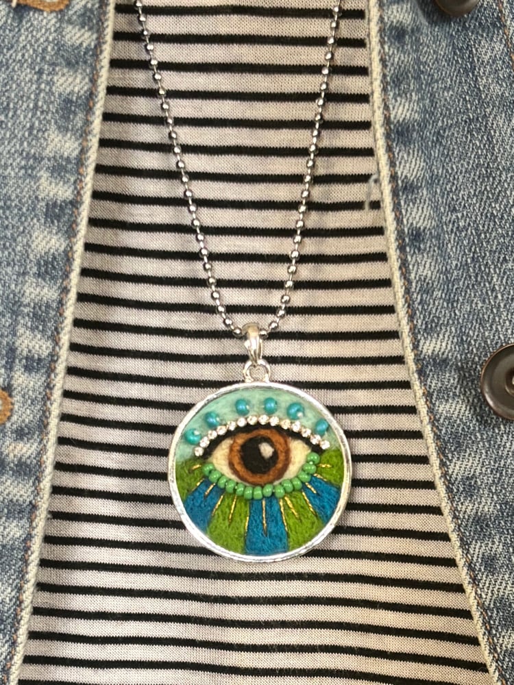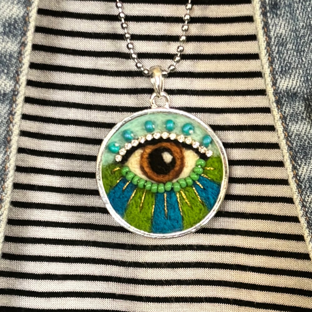 A hand felted mystic eye, embellished with rhinestones and glass beads, in a bright silver base metal pendant.