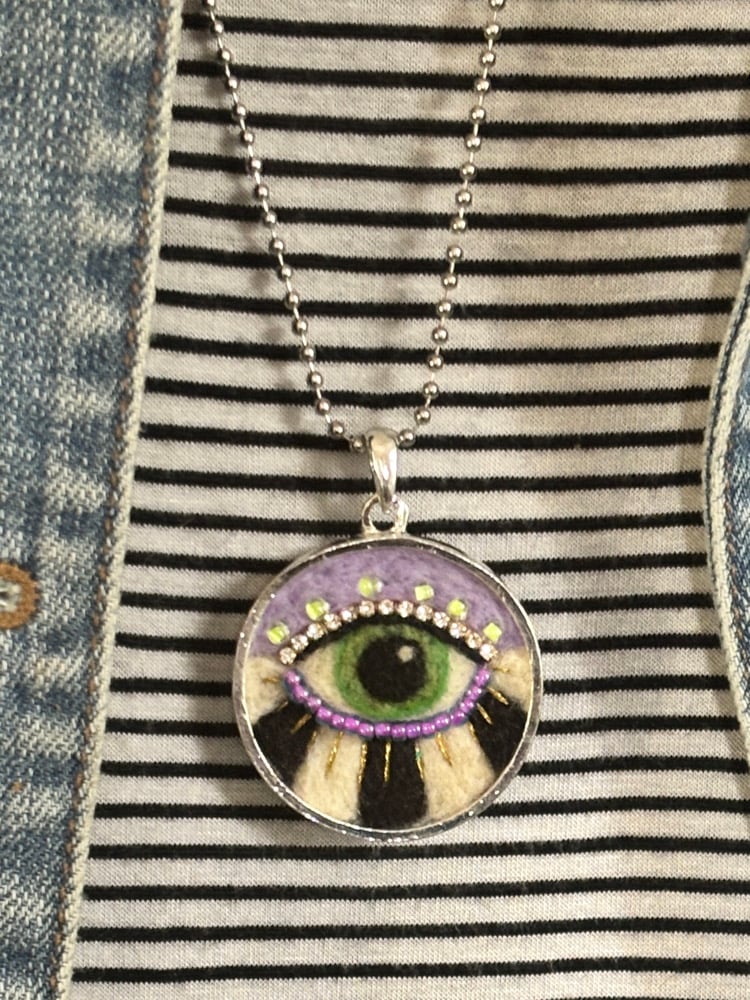 A hand felted mystic eye, embellished with rhinestones and glass beads, in a bright silver base metal pendant.