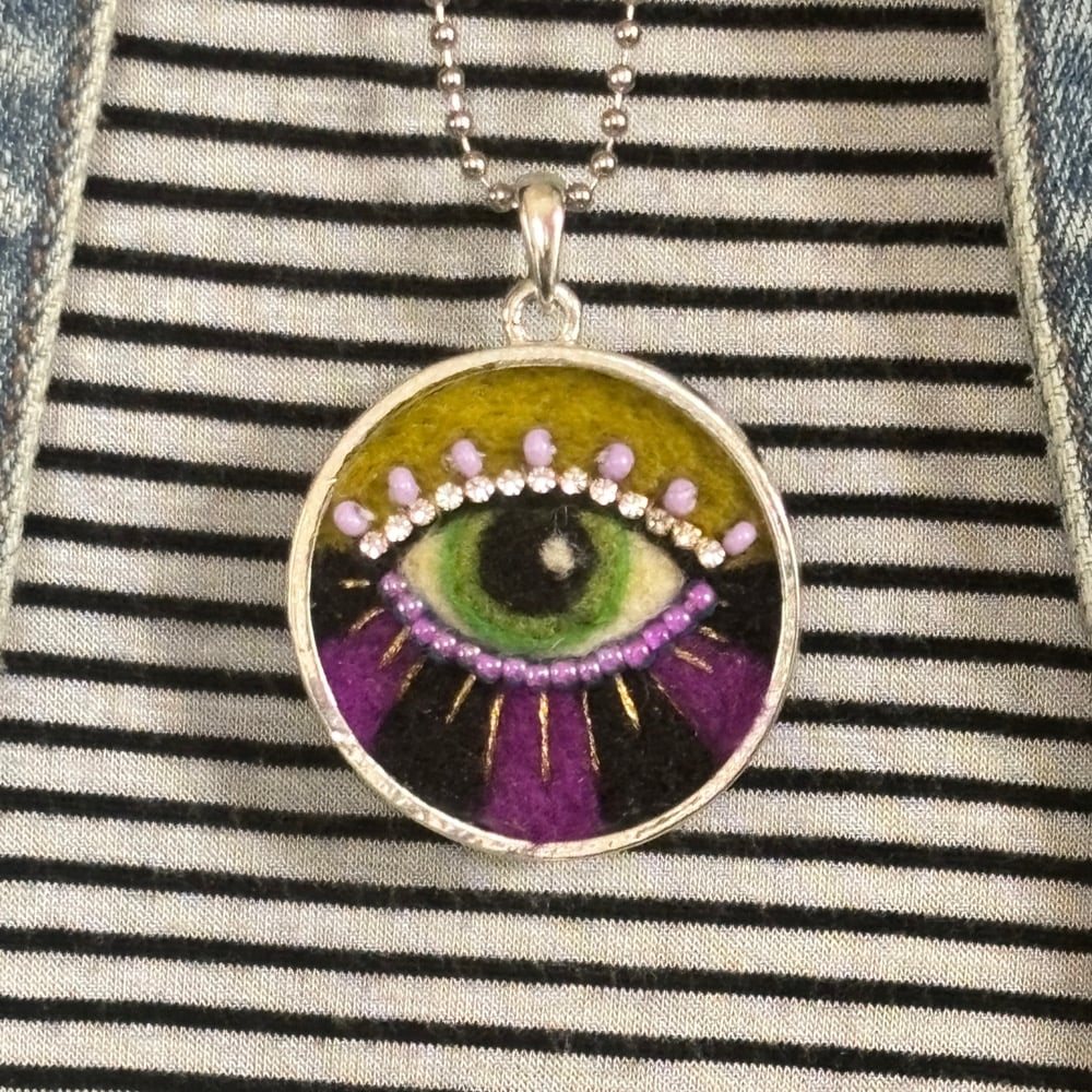A hand felted mystic eye, embellished with rhinestones and glass beads, in a bright silver base metal pendant.