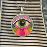 A hand felted mystic eye, embellished with rhinestones and glass beads, in a bright silver base metal pendant.