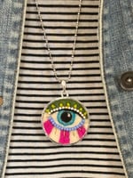 A hand felted mystic eye, embellished with rhinestones and glass beads, in a bright silver base metal pendant.