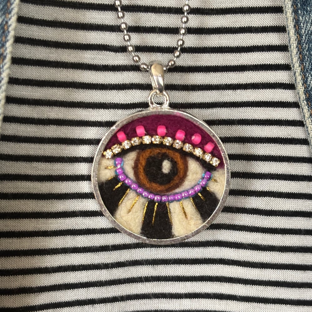 A hand felted mystic eye, embellished with rhinestones and glass beads, in a bright silver base metal pendant.