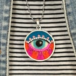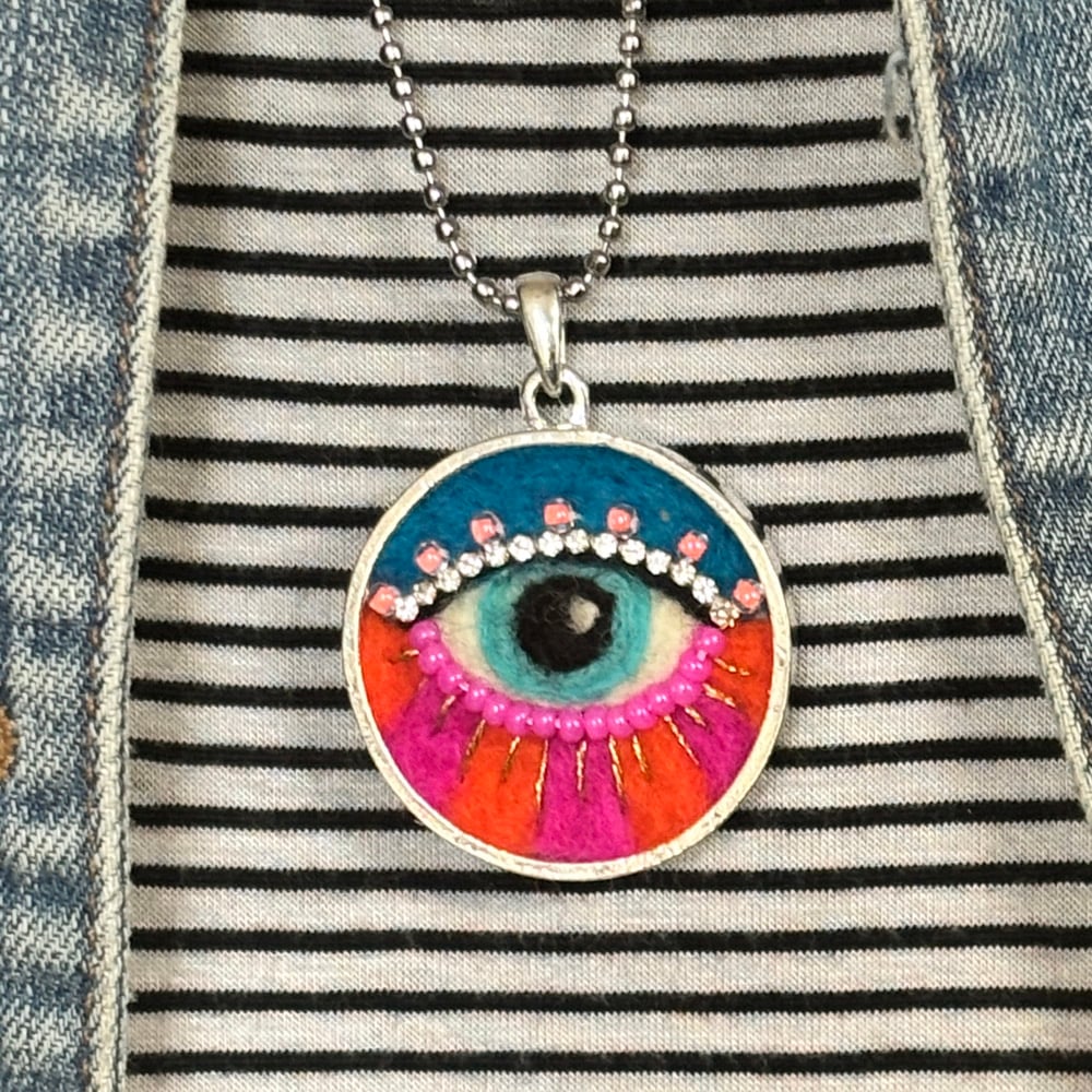 A hand felted mystic eye, embellished with rhinestones and glass beads, in a bright silver base metal pendant.