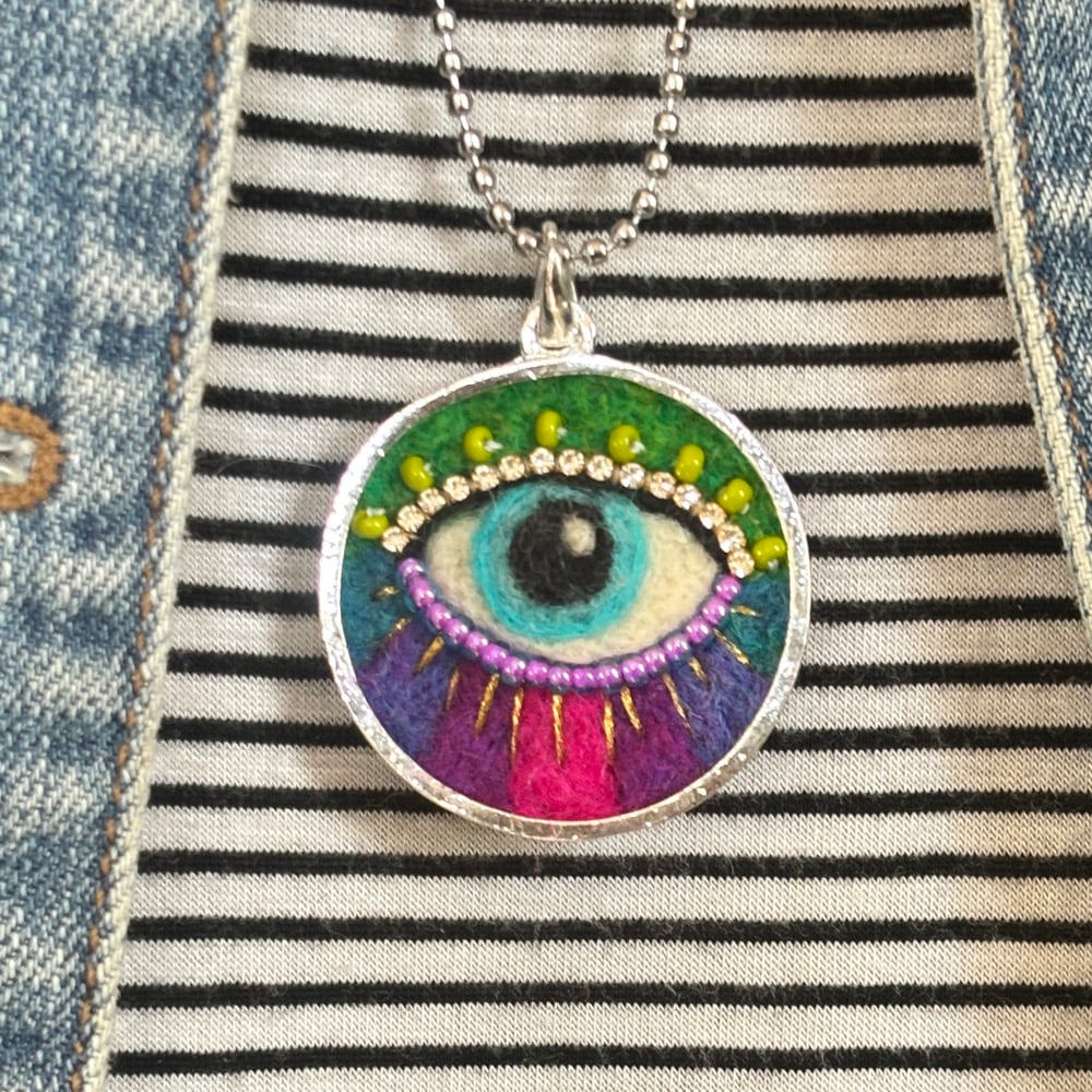 A hand felted mystic eye, embellished with rhinestones and glass beads, in a bright silver base metal pendant.