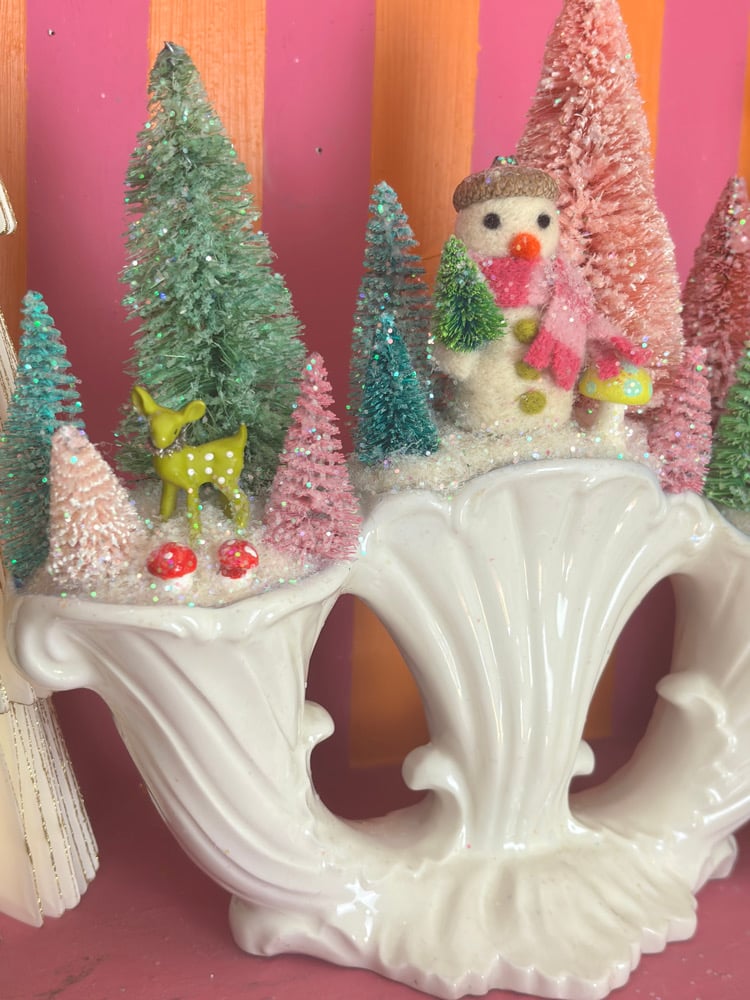 This fairytale forest of hand-dyed bottle brush trees and a hand-felted snowman with a real acorn cap is housed in a vintage dish and is ready to add some whimsical Christmas nostalgia your holiday decor!