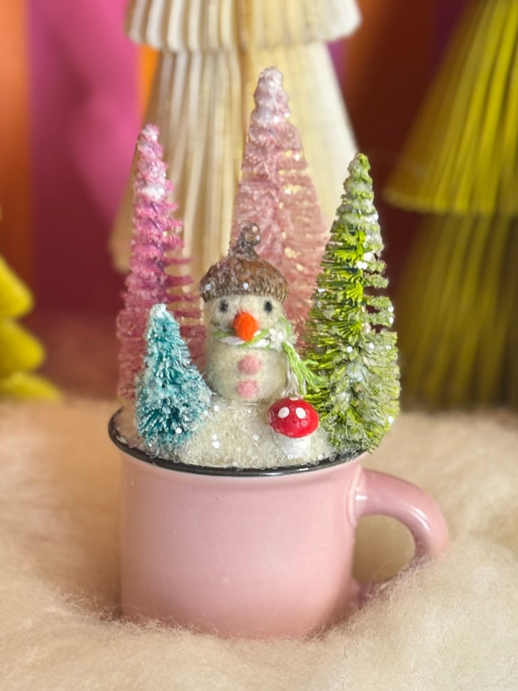 This fairytale forest of hand-dyed bottle brush trees and a hand-felted snowman with a real acorn cap is housed in a small vintage style mini ceramic mug and is ready to add some whimsical Christmas nostalgia your holiday decor!