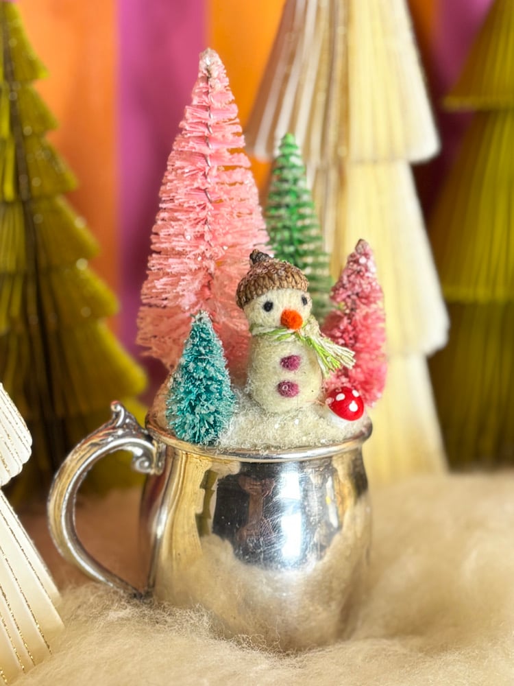 This fairytale forest of hand-dyed bottle brush trees and a hand-felted snowman with a real acorn cap is housed in a small vintage silver cup and is ready to add some whimsical Christmas nostalgia your holiday decor!