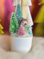 This fairytale forest of hand-dyed bottle brush trees and a hand-felted snowman with a real acorn cap is housed in a small vintage style mini ceramic cup and is ready to add some whimsical Christmas nostalgia your holiday decor!