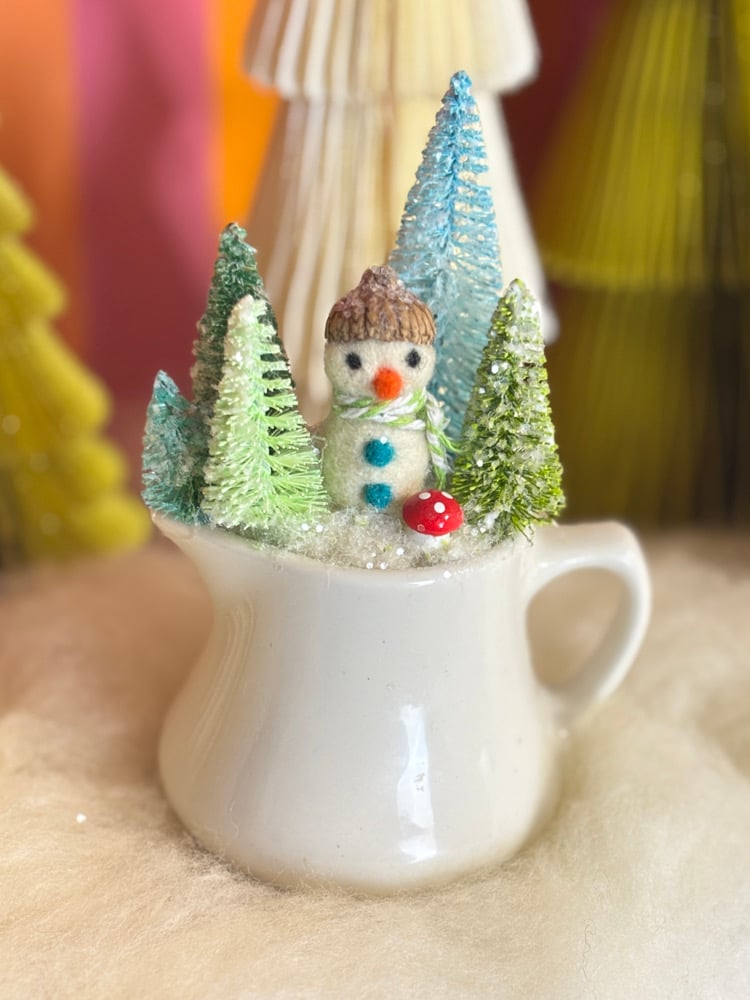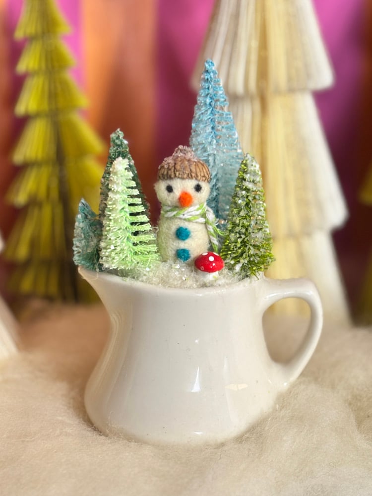 This fairytale forest of hand-dyed bottle brush trees and a hand-felted snowman with a real acorn cap is housed in a small vintage mini ceramic pitcher and is ready to add some whimsical Christmas nostalgia your holiday decor!